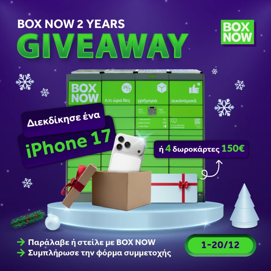 Επίλεξε την υπηρεσία BOX NOW για παραλαβή από τα αγαπημένα σου συνεργαζόμενα e-shops ή στείλε δέμα, συμπλήρωσε την παρακάτω φόρμα και μπες στην κλήρωση! 🏆Ο μεγάλος τυχερός θα κερδίσει ένα iPhone 17 📲 και οι επόμενοι 4 από μία δωροκάρτα 150€ για αγορές σε είδη τεχνολογίας, ψυχαγωγίας και οικιακές συσκευές. 🛍️