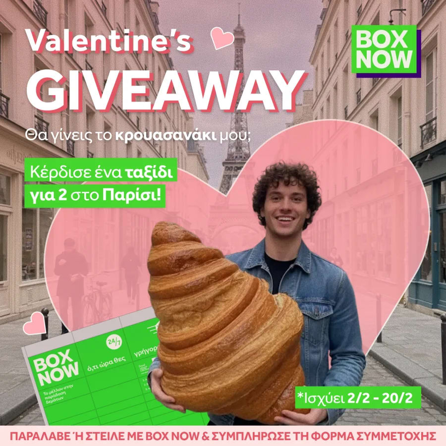💗 𝗩𝗮𝗹𝗲𝗻𝘁𝗶𝗻𝗲'𝘀 𝗗𝗮𝘆 𝗚𝗶𝘃𝗲𝗮𝘄𝗮𝘆 💗Θέλεις να ζήσεις το απόλυτο ρομαντικό όνειρο στην Πόλη του Φωτός; Στη BOX NOW σε στέλνουμε στο Παρίσι με το ταίρι σου! ✈️🇫🇷